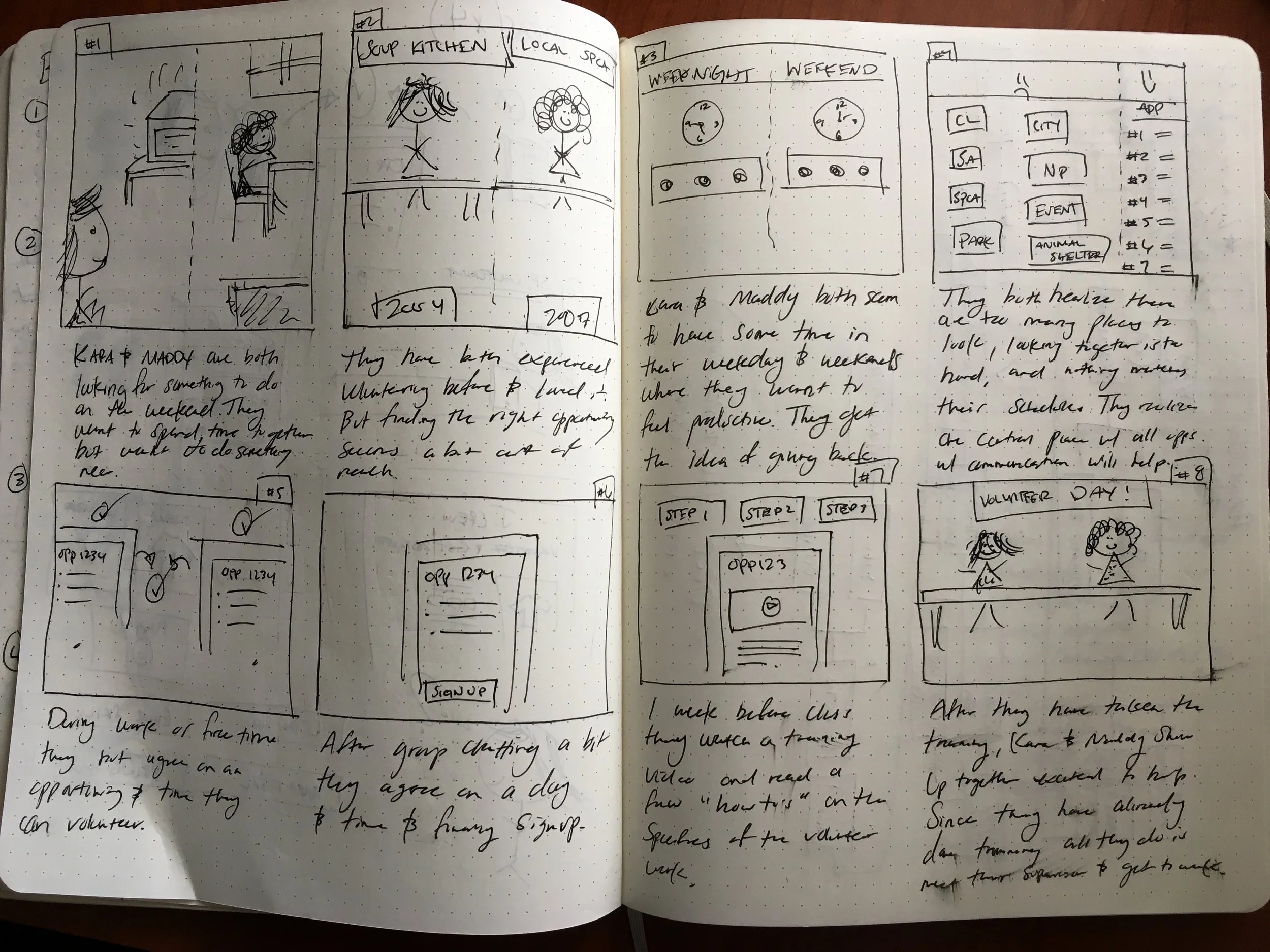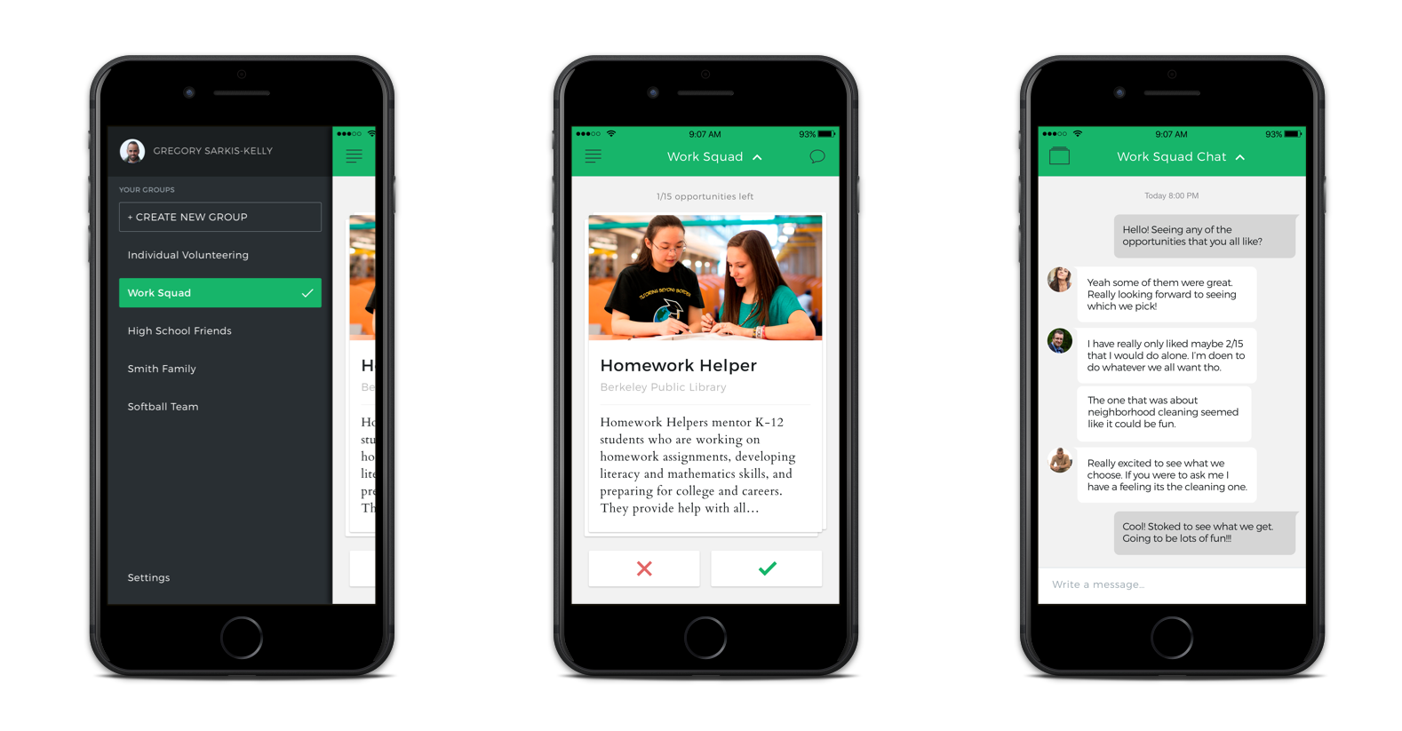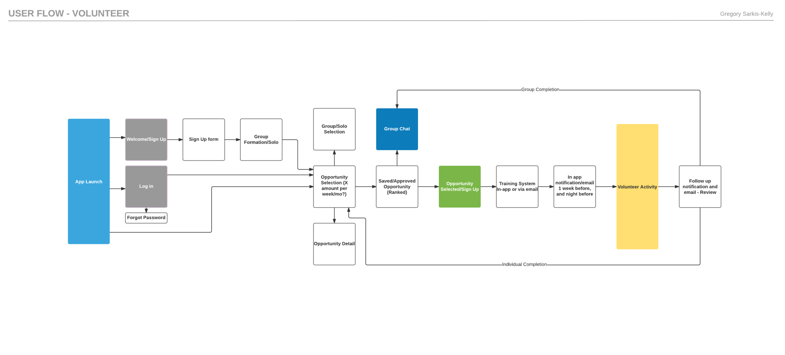 To begin the process of visual design, I collected screenshot of competitor apps to understand what visual trends already exist in this space. After researching all competitors from my Competitive analysis it seemed that light Greens and Blues were popular for community applications such as this. With this I chose a green as my main color with supporting colors of Green-Blue, Black, White, and Grays. As I wanted to keep the focus on the content and off the header’s iconography, I chose black line icons in the top bar to be visible while not being the focus of the screen or distracting the eye. I decided on typefaces of a Sans-Serif (Montserrat) for bold headings and subheadings, while using a Serif (Cardo) font for body type which is easier to read and softer on the eye. Finally in order to give volunteers a the best visual understanding of each volunteer opportunity, I made sure to use full bleed images during card sorting, detail views, and training modules. All of these elements were chosen with the user in mind, to create an atmosphere where they can feel comfort and trust.