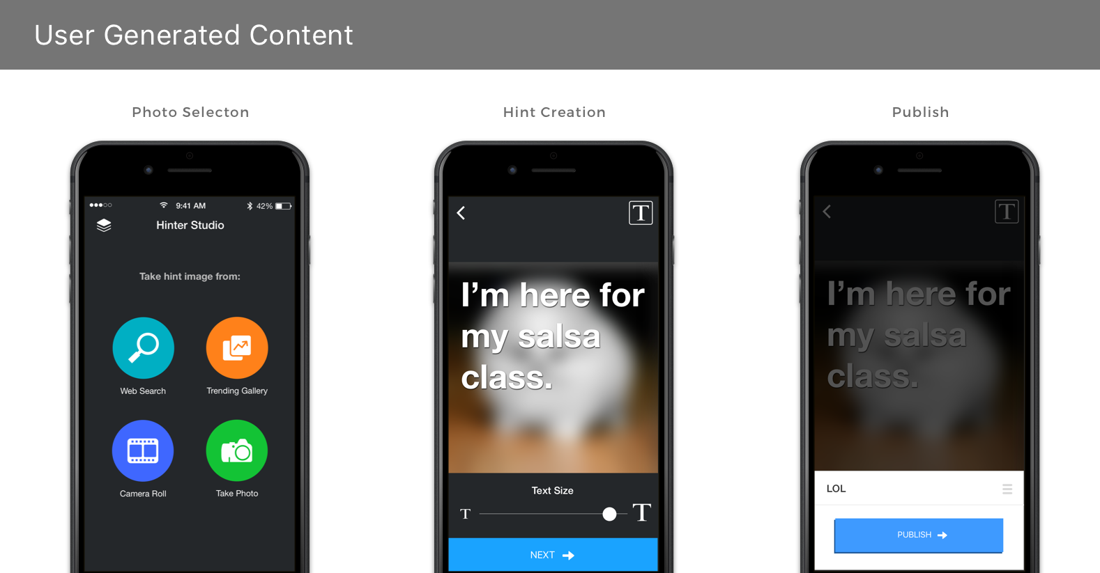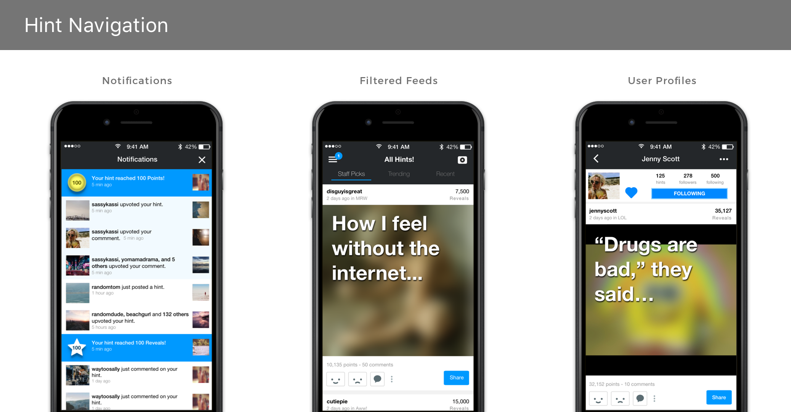 Hinter was created with the mission to make people smile. The executive vision for the product took existing ‘flat’ web-ready comedic content (such as memes), and created a new content medium by adding interaction to create engagement through surprise. Redesigning Hinter’s experience to accommodate our users’ desire for engaging comedic content was imperative to our process. Our core KPIs were increased reveals, upvotes, and shares, thus we strategized our content to feel more relevant, organized, and accessible. The results of our recent redesign were encouraging, as we significantly increased retention, engagement, and accessibility to 3rd party clients.